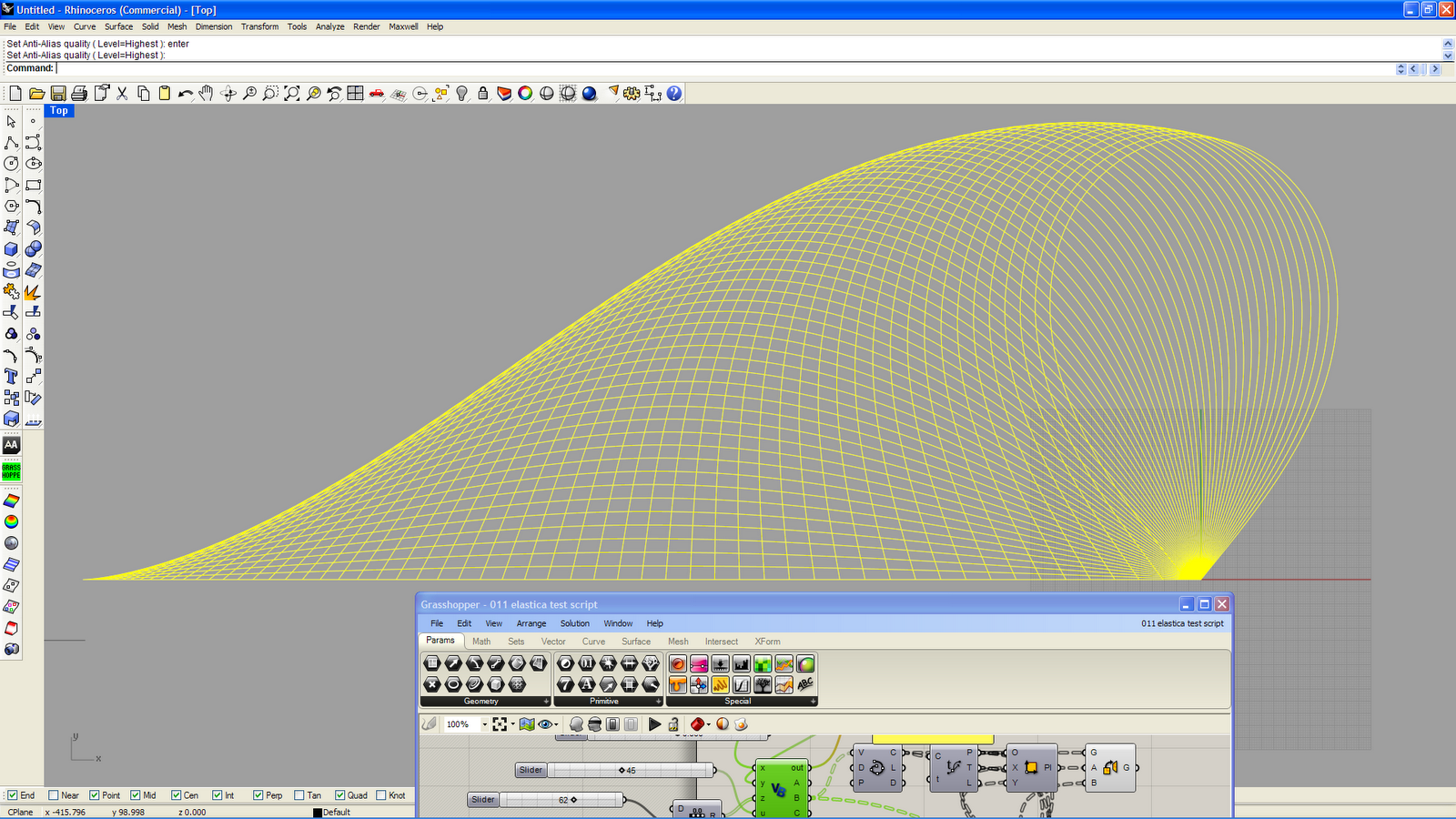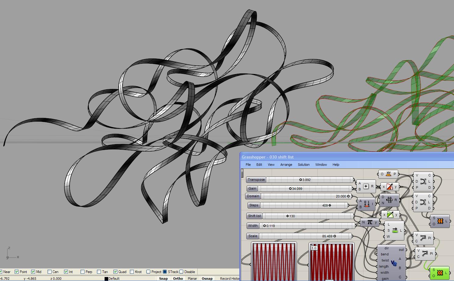 MD-slider controlling Bending on Y-axes and twisting (left/right) on X-axes. Surface is Baked to Rhino and then unrolled to become flat and straight. Other versions here: