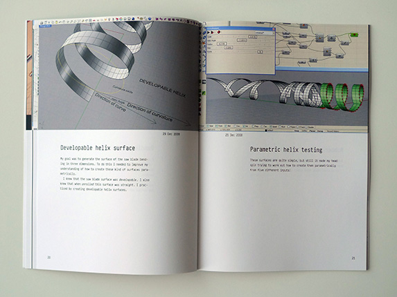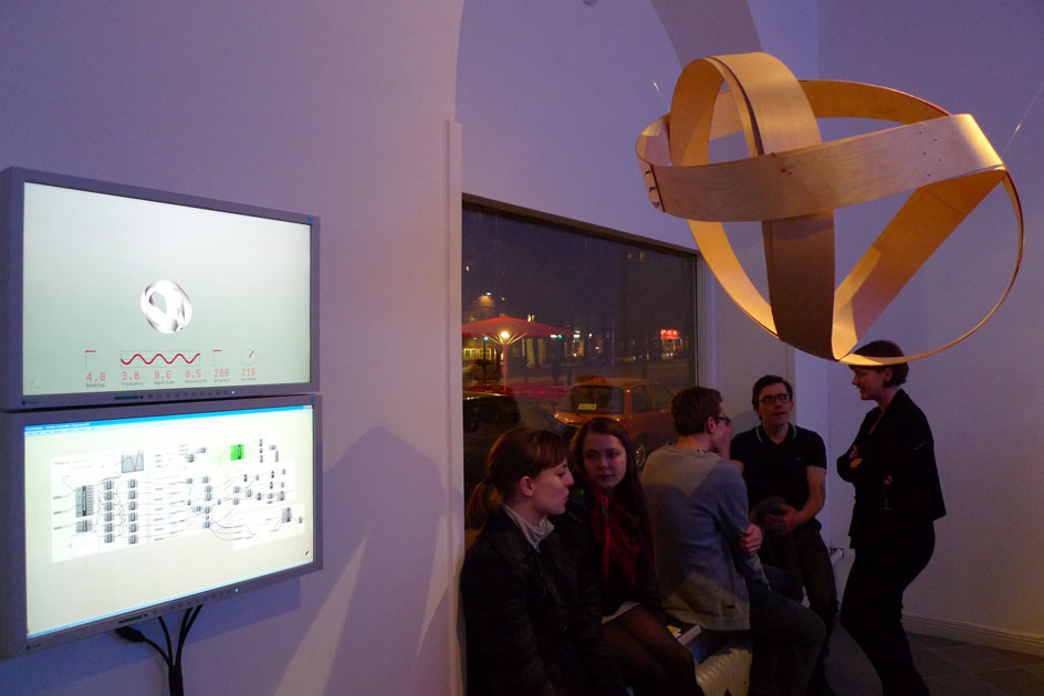 Searching for the obviousMårten NettelbladtWhen you bend a thin strip of plywood you get a beautifully shaped curve. What geometry does this curve follow? There is a peaceful simplicity to the shape, and yet, it doesn't fall into the normal categories of basic geometric shapes as we know them. The exhibition shows two different ways to approach this challenge. Part one: A plywood strip, twelve meters long, curled and twisted into a double loop shape. This geometry is a result of the material trying to resist, and thereby minimize, the forces of bending and torsion. Part two: A computer generated surface, curling and twisting according to user input. Two lists of values control the curvature and the direction of the surface. The resulting single-curved surface will always be developable and unroll to a straight strip. Question: Is there a simple mathematical solution that will produce the same geometry as in the plywood loop? The search continues.Special thanks toDavid Rutten, McNeelAndy Payne & Jason K. Johnson, Firefly ExperimentsGrasshopper Forum